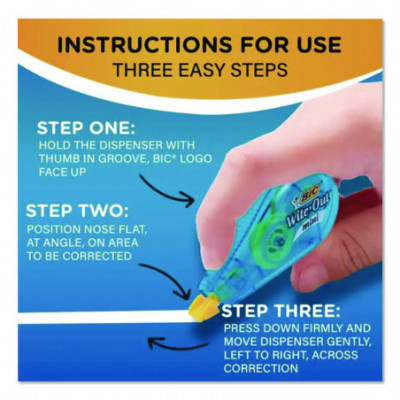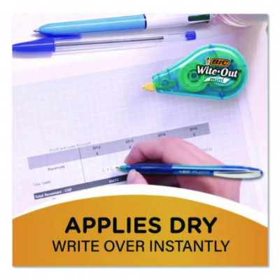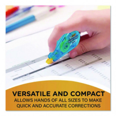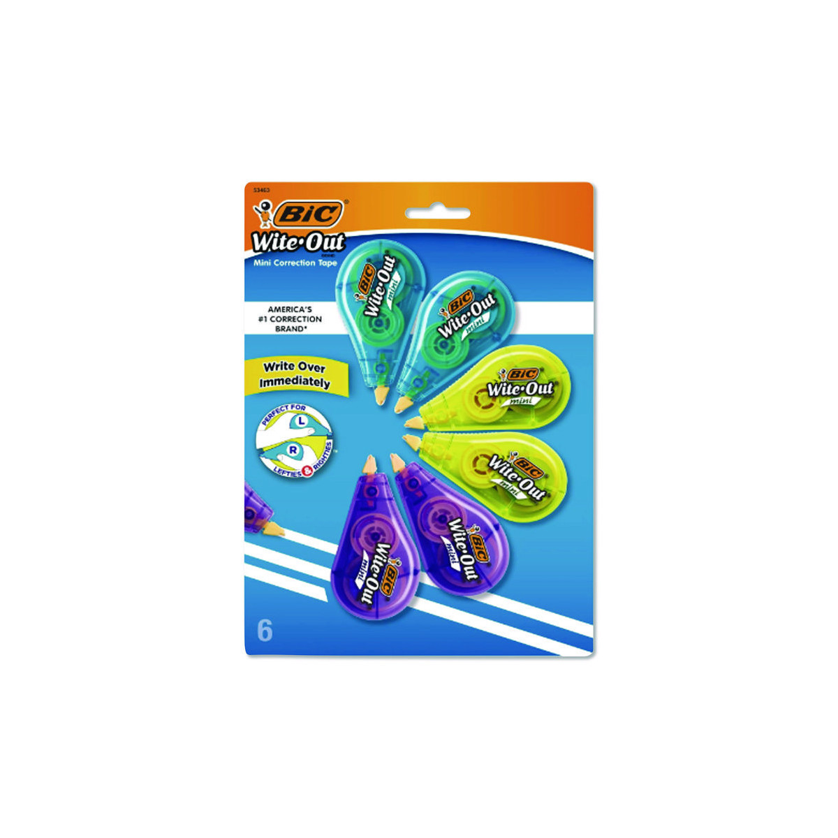 Fix mistakes fast with BIC Wite-Out Brand Mini Correction Tape! Suitable for lefties and righties, these brightly-colored correction tape dispensers are compact enough to fit in any bag. The correction tape goes on dry, allowing you to make instant corrections with no mess and no waiting time, while the convenient size allows hands of all sizes to make quick and accurate corrections.