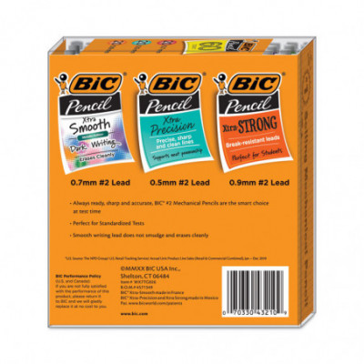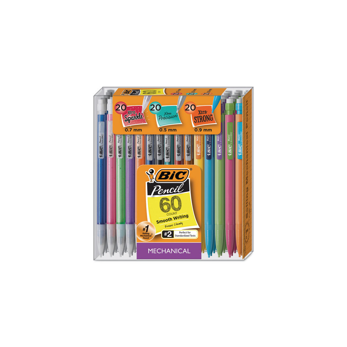 Get the best of both worlds with this mechanical pencil value pack including a 60-count mixture of fine point, medium point, and thick point mechanical pencils. The smooth writing lead does not smudge and erases cleanly with the lead advancing quickly and easily. One BIC mechanical pencil is equal to 2.5 wood case pencils, giving you more for your money. Perfect for standardized tests. Pack includes 20 Xtra Precision pencils with 0.5 mm fine point, 20 Xtra Sparkle pencils with 0.7 mm medium point, and 20 Xtra Strong pencils with 0.9 mm thick point.