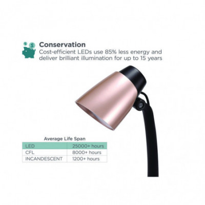 If you're in search for a simple lamp with style, then this LED rose gold desk lamp is calling your name. With a black lamp arm and base, it takes on a classic look, ideal for an office, in a dorm or on a bedside table. The metallic rose gold lampshade brings a light pop of color, providing this lamp is a modern style. This rose gold lamp mimics the look of natural daylight, perfect for those long, focused days at work. Additionally, it uses only 3.5 watts of power and uses LEDs that last up to 50,000 hours. Reliable and easy to use, this desk lamp is too good to pass up.