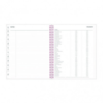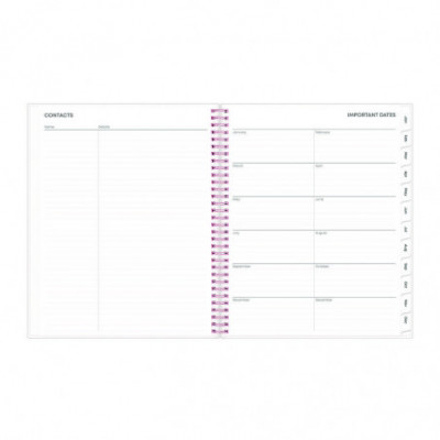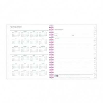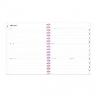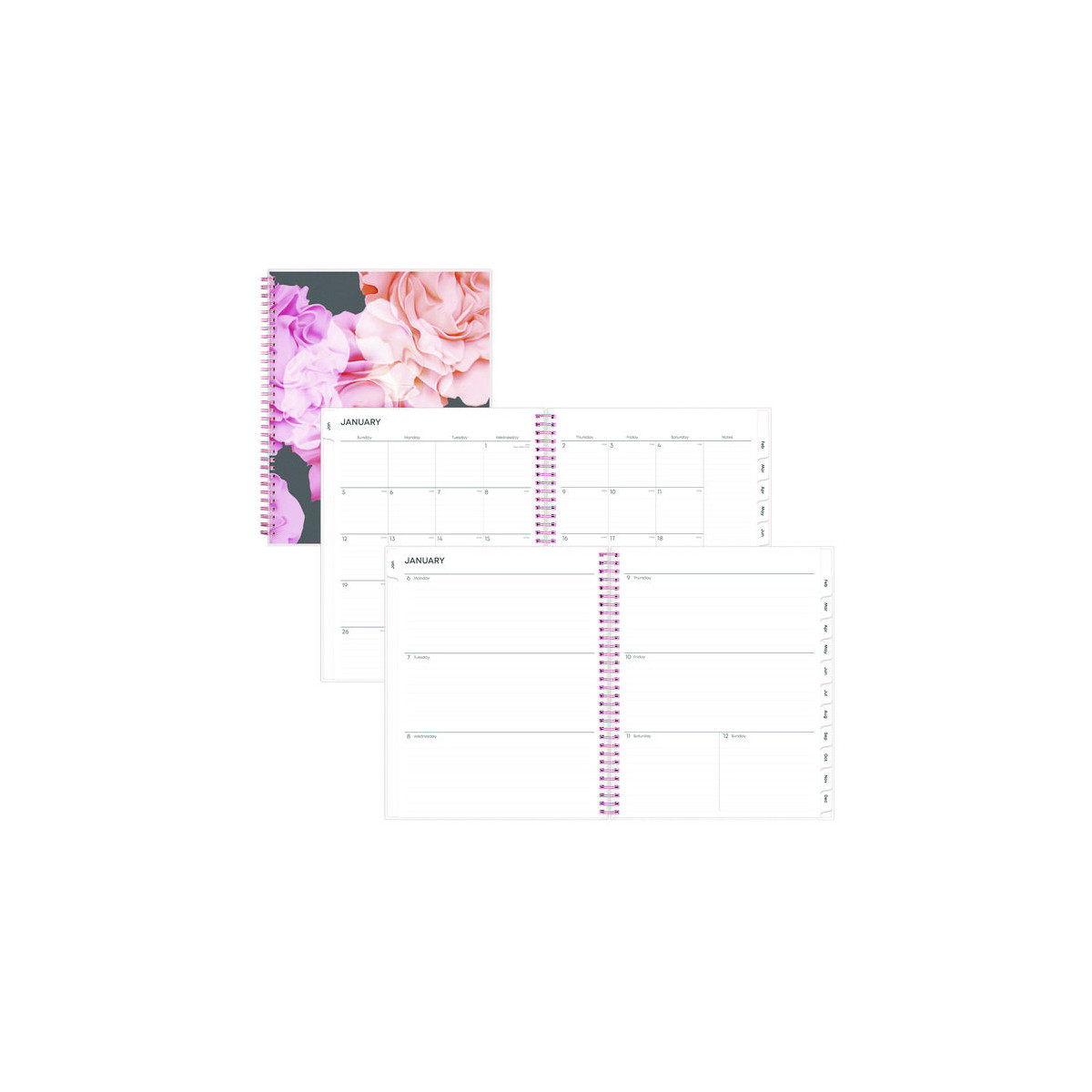 Elegant florals to accent your everyday scheduling. Weekly calendar view per two-page spread contains ruled space for your daily schedule Two page per month spreads feature ruled daily blocks, Notes column, Sunday through Saturday scheduling, count of days/days remaining, holidays and past and future months reference. A flexible frosted cover adorns the outside while twin-wire binding and durable, coated tabs offer easy page turning and access to past, present and future months. Includes six bonus monthly views (July - Dec).