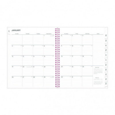 Weekly calendar view per two-page spread contains ruled space for your daily schedule. Two page per month spreads feature ruled daily blocks, Notes column, Sunday through Saturday scheduling and more. A flexible frosted cover adorns the outside while twin-wire binding and durable, coated tabs offer easy page turning and access to past, present and future months. Six bonus monthly views (July - Dec).