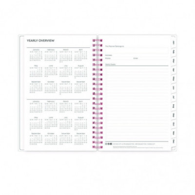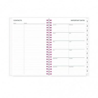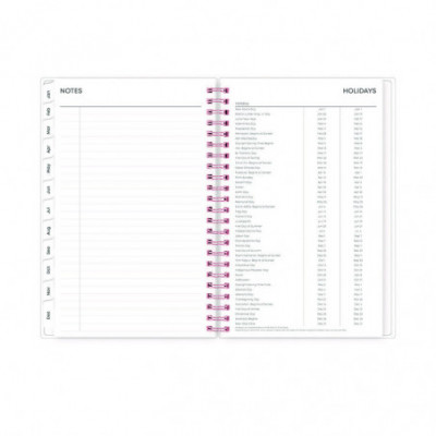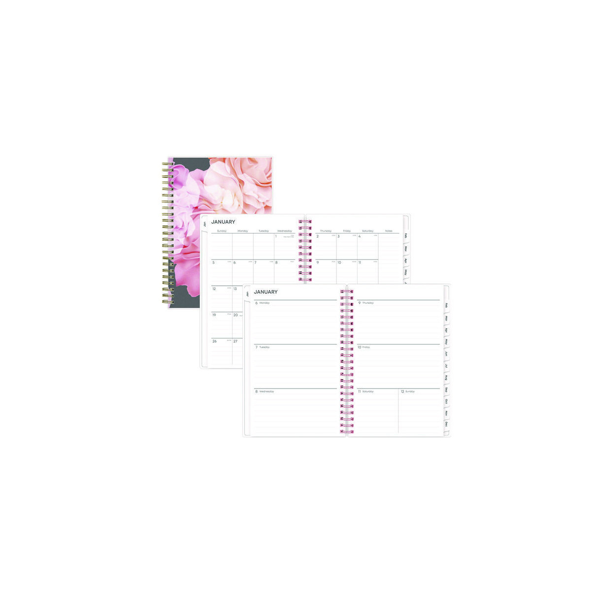 Elegant florals to accent your everyday scheduling. Weekly calendar view per two-page spread contains ruled space for your daily schedule Two page per month spreads feature ruled daily blocks, Notes column, Sunday through Saturday scheduling, count of days/days remaining, holidays and past and future months reference. A flexible frosted cover adorns the outside while twin-wire binding and durable, coated tabs offer easy page turning and access to past, present and future months. Includes six bonus monthly views (July - Dec).