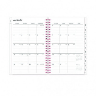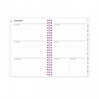 Weekly calendar view per two-page spread contains ruled space for your daily schedule. Two page per month spreads feature ruled daily blocks, Notes column, Sunday through Saturday scheduling and more. A flexible frosted cover adorns the outside while twin-wire binding and durable, coated tabs offer easy page turning and access to past, present and future months. Six bonus monthly views (July - Dec).