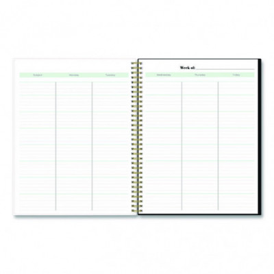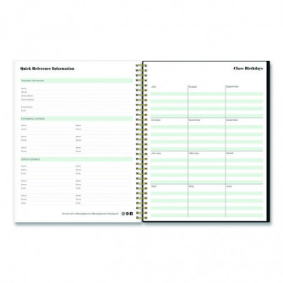 Undated weekly section features a two-page columnar format for up to nine periods/classes, Monday through Friday, and the undated monthly section features a one-month per two-page layout to ensure you have plenty of space for extra notations. Additional sections include an area for managing special weekly activities, a full-year grid for noting student birthdays, a list of holidays and ruled notes pages.