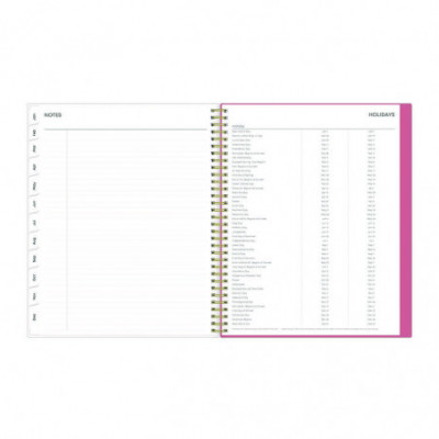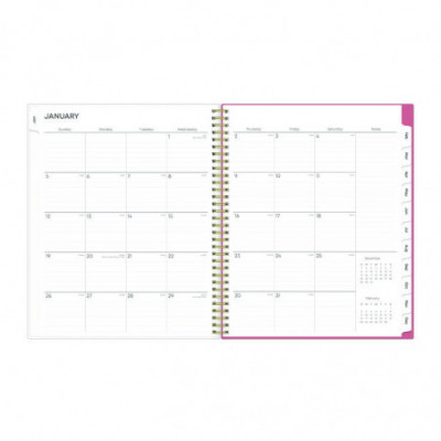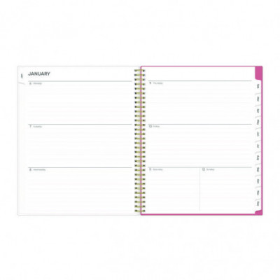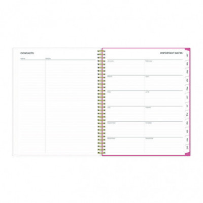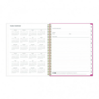 Frame your plans with elegance. Butterflies flit across this beautiful Fly By cover and bring peace to your busy schedule with its graceful pink and blue florals on a cream background. Two-page-per-week spread features lined daily blocks. Monthly view per two-page spread includes a Notes section for important projects. Monthly tabs are coated for durability. Durable, frosted flexible front cover. Twin-wire binding offers easy page turning. Includes pages for Yearly Goals, Contacts, Reference Calendars, and extra Notes pages. Thick, premium quality pages reduce ink bleed-through. Includes six bonus past monthly views for easy yearly transition (July-Dec).