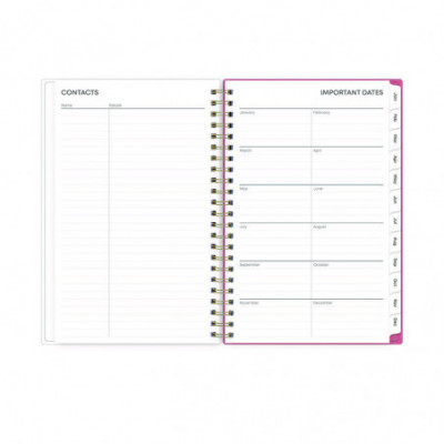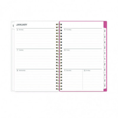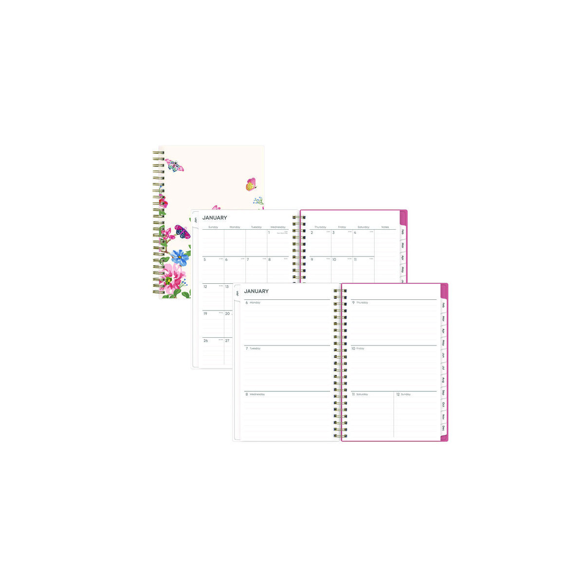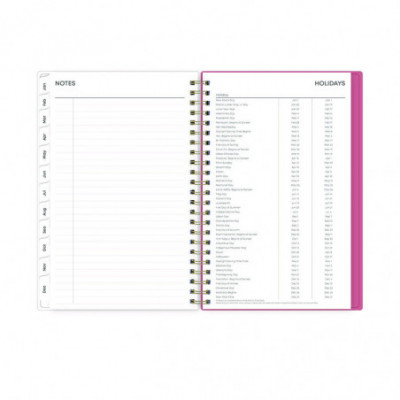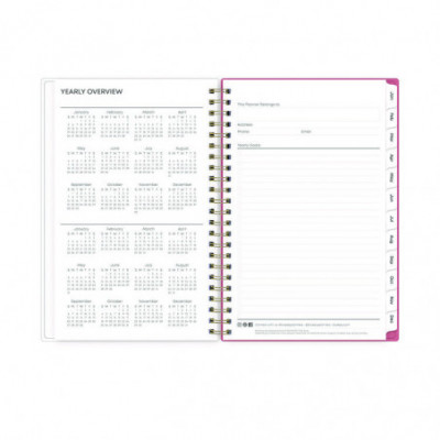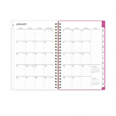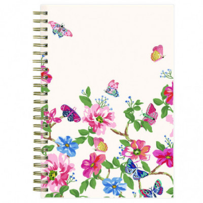 Frame your plans with elegance. Butterflies flit across this beautiful Fly By cover and bring peace to your busy schedule with its graceful pink and blue florals on a cream background. Two-page-per-week spread features lined daily blocks. Monthly view per two-page spread includes a Notes section for important projects. Monthly tabs are coated for durability. Durable, frosted flexible front cover. Twin-wire binding offers easy page turning. Includes pages for Yearly Goals, Contacts, Reference Calendars, and extra Notes pages. Thick, premium quality pages reduce ink bleed-through. Includes six bonus past monthly views for easy yearly transition (July-Dec).