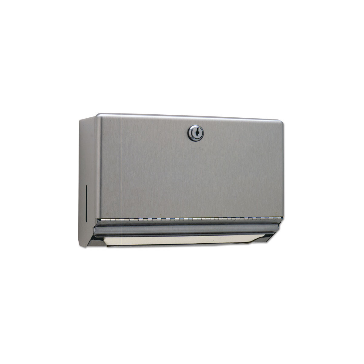 Satin-finish stainless steel towel dispenser. Dispenser is convenient to surface or wall-mountable. Holds c-fold or multifold towels. Key-latch door for easy towel refills. Hemmed towel tray opening allows patrons easy access to towels.