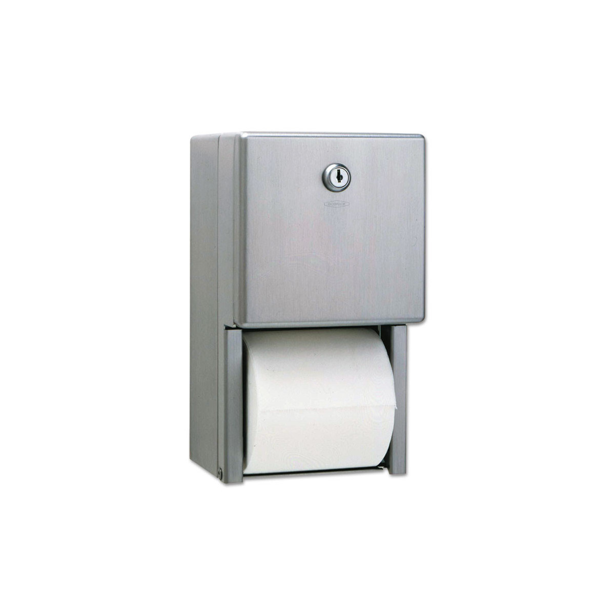 Holds two standard rolls up to 5 1/4". Extra roll automatically drops into place when bottom roll is depleted. Reduces maintenance time and need for replacement. Door has tumbler lock. Spindles are heavy-duty and theft-resistant. Satin finish.