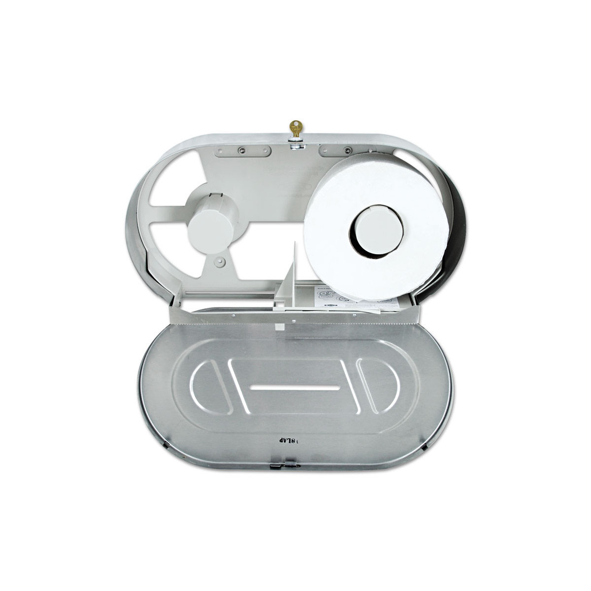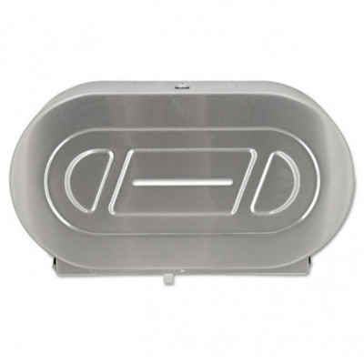 Jumbo toilet paper dispenser holds two rolls of 10-inch diameter, which makes it great for high-traffic areas. Sliding panel on the bottom exposes only one roll at a time and allows you to easily changeover from one roll to the other. Wide viewing slot in the dispenser allows you easily view how much toilet paper is left on both rolls. Dispenser is equipped with a tumbler lock, which prevents theft and makes for quick and easy reloading. Dispenser itself is made of stainless steel, with a smooth, pleasant satin finish.
