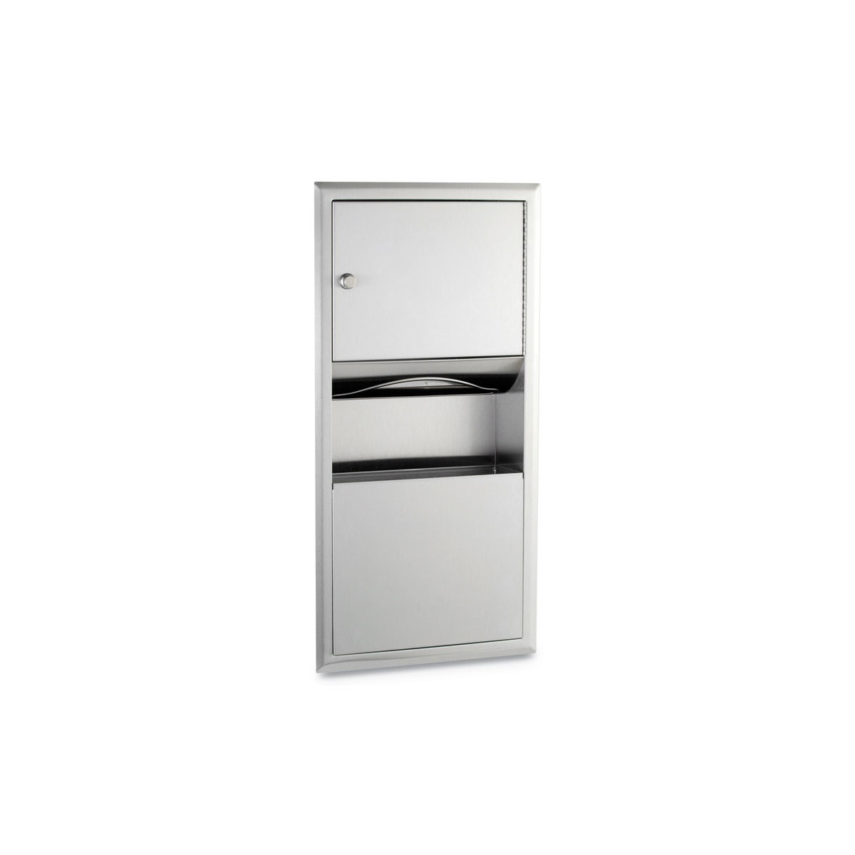 Dispenses 350 C-fold or 475 multi-fold towels. Removable waste container has 2-gal. capacity. Rough wall opening.