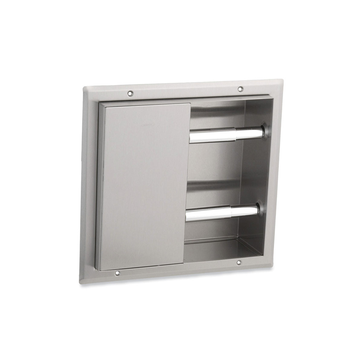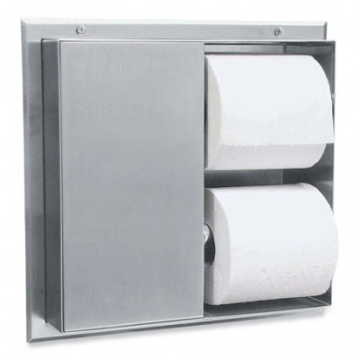 Satin-finish stainless steel dispenser mounts centered through toilet partitions, 0.5" to 2" thick; used from both sides. Holds four standard core toilet tissue rolls up to 5.13" diameter.