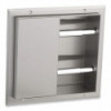 Satin-finish stainless steel dispenser mounts centered through toilet partitions, 0.5" to 2" thick; used from both sides. Holds four standard core toilet tissue rolls up to 5.13" diameter; two for each side. Chrome-plated plastic spindles with heavy-duty internal springs. Rough Partition Opening: 11.5" w x 10.88" h. Type-304, 22-gauge stainless steel.