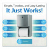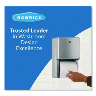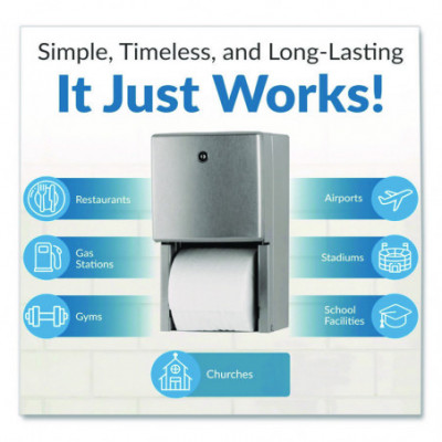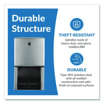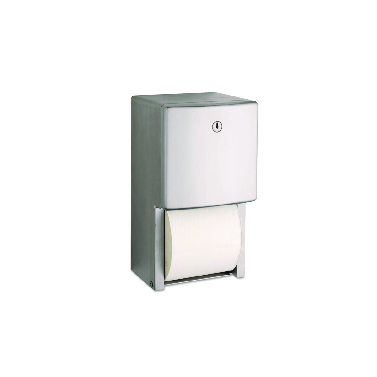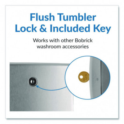 Satin-finish stainless steel unit. Flush tumbler lock. Extra roll automatically drops in place when bottom roll is depleted.