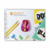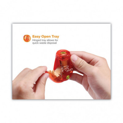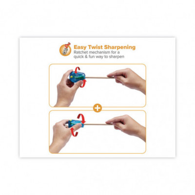 Two-hole pencil sharpener features ratchet technology in the sharpener for easy sharpening. The ratchet allows for faster sharpening without ever having to let go of the pencil.