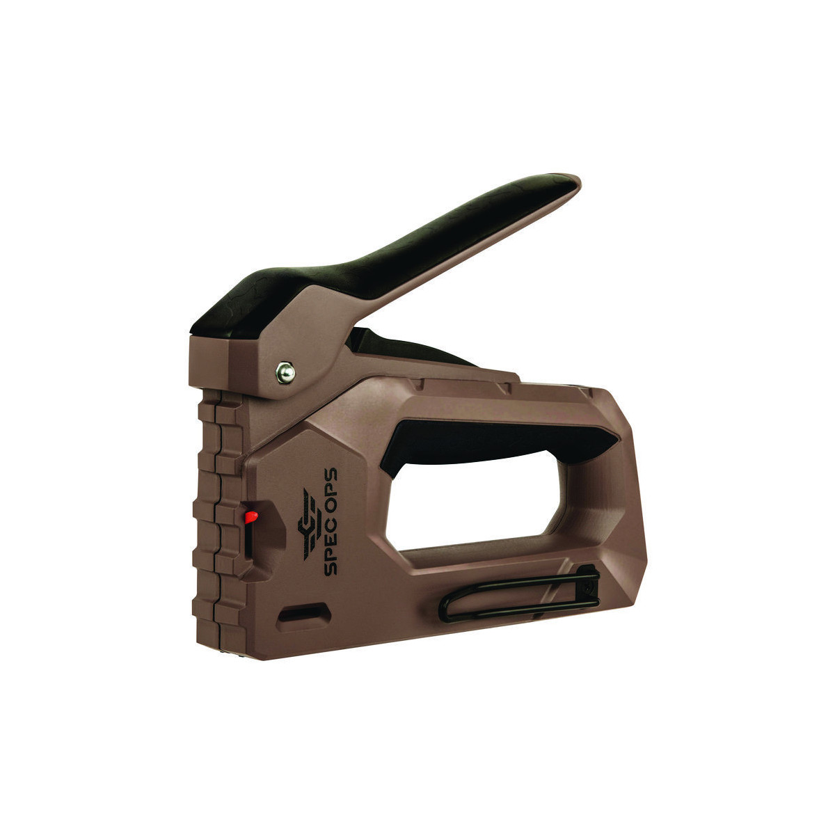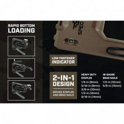 The 2-in-1 heavy-duty staple gun/brad nailer features Spec Ops patented Torsion Spring Technology for up to 50% easier squeezing that reduces hand fatigue and increases accuracy. Up to 25% lighter design with a military grade composite housing, this staple gun is light on the belt yet delivers extreme staple driving power. Utilizes heavy duty, T50 style, staples and brads.