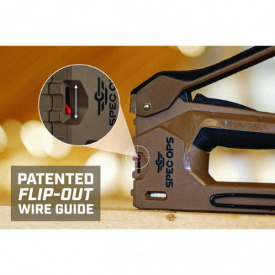 The 2-in-1 heavy-duty staple gun/brad nailer features Spec Ops patented Torsion Spring Technology for up to 50% easier squeezing that reduces hand fatigue and increases accuracy. Up to 25% lighter design with a military grade composite housing, this staple gun is light on the belt yet delivers extreme staple driving power. With a patented, flip-out wire guide, this hand stapler allows for precision stapling over cables and includes a low fastener indicator for added convenience. The all-metal, reversible belt hook is designed for left- and right-hand access. Utilizes heavy duty, T50 style staples (1/4-in, 9/16-in) and 18-gauge brads (1/2-in to 5/8-in). Perfect for insulation, house-wrap, fabric, upholstery wood or furniture repair. The bottom load design allows for rapid re-loading and fail-safe jam clearing. We support our nation's heroes by donating 3% of proceeds to veteran and first responder causes.
