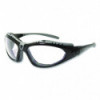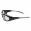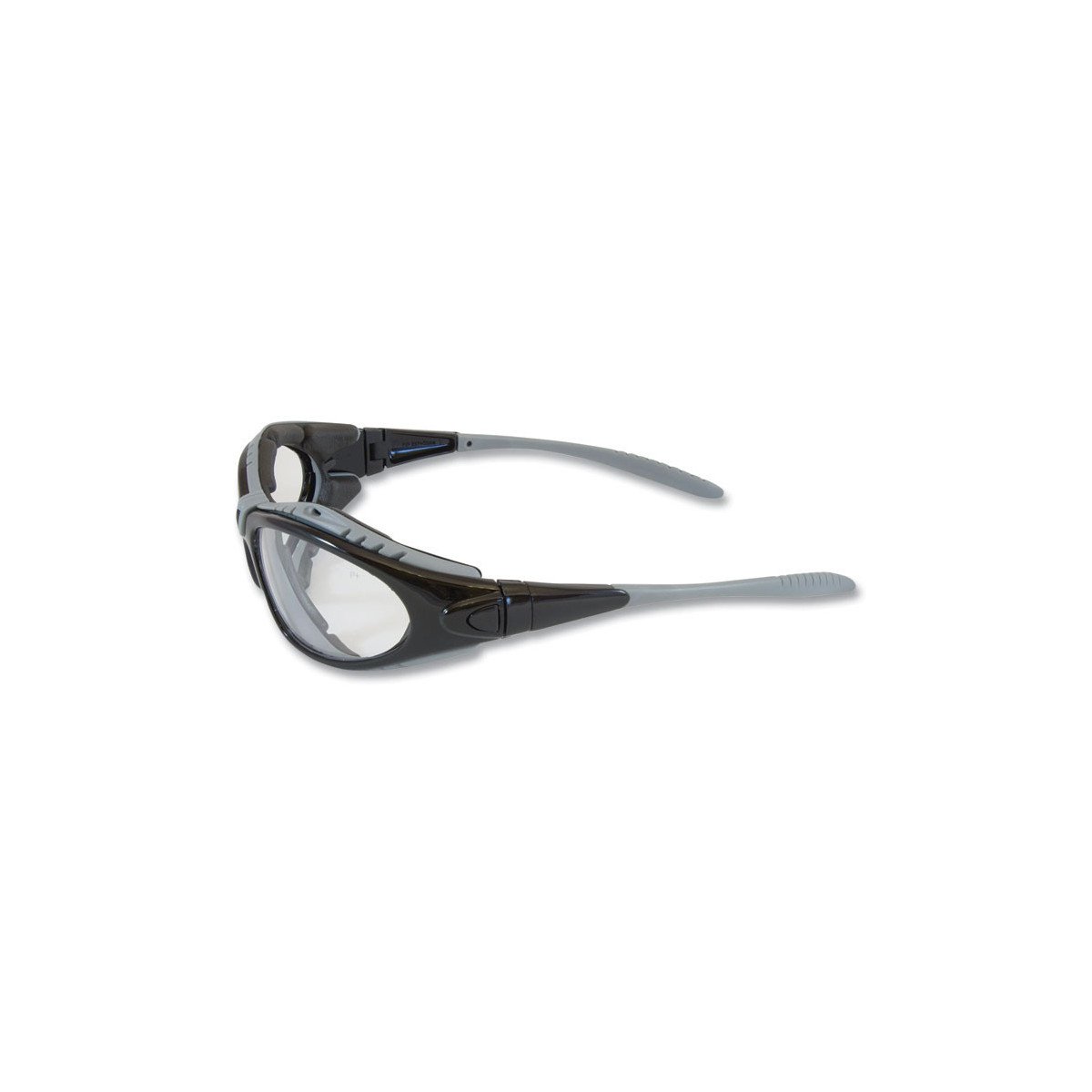 Comes with both temples and elastic headband strap. Temples and strap snap in or out; easily converts from a safety glass to a dust goggle and back. Clear lens with elegant black frame and anti-fog/anti-scratch coating. 8 base curve lens, ideal for harsh environment. Goggle includes flame resistant soft foam padding to keep out dust and airborne particles. Nylon temples with rubber tips for a secure fit.
