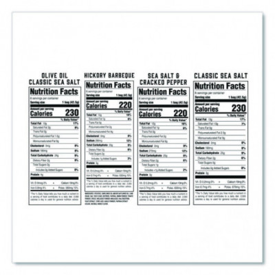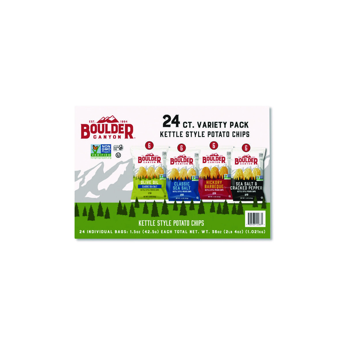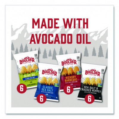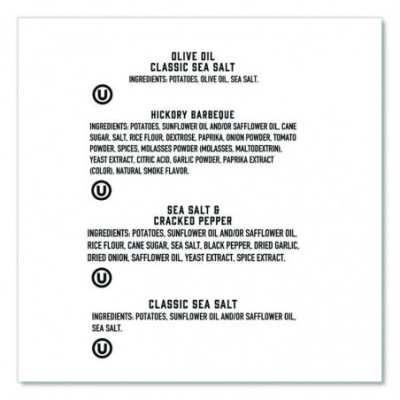 Contains four delicious flavors of kettle cooked chips. Includes six hickory barbeque chips, six sea salt chips, six sea salt and cracked pepper chips, and six olive oil chips.