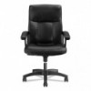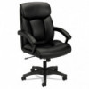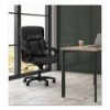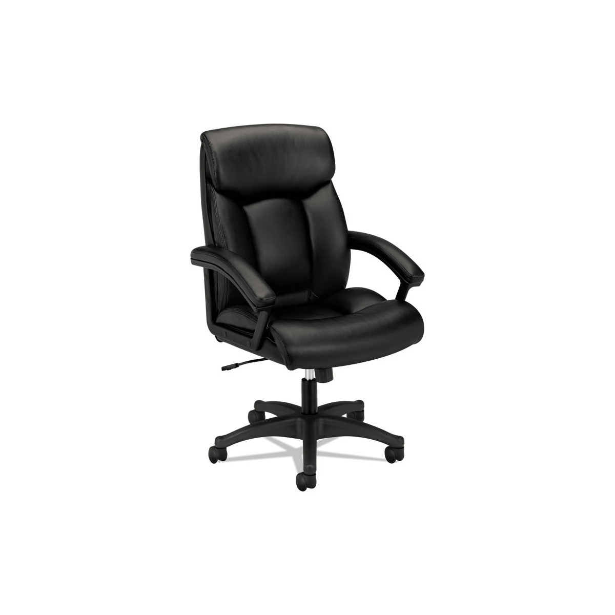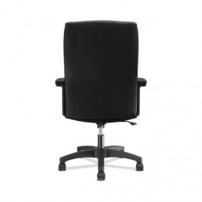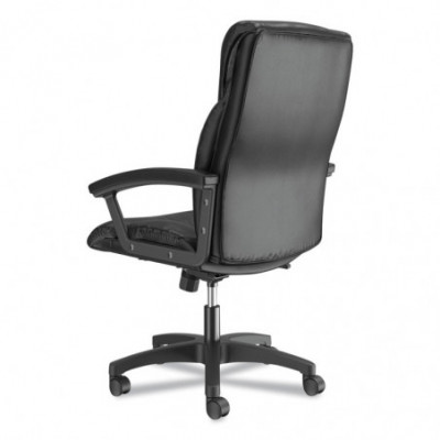 A distinctive and comfortable seating experience. Luxurious black bonded leather upholstery. Plush, overstuffed back and padded loop arms. Five-star base with casters for easy mobility.