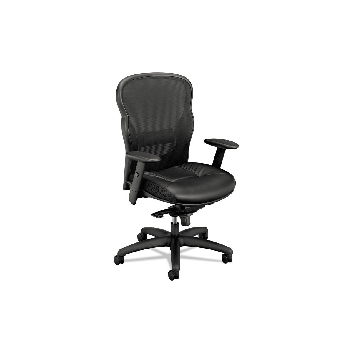 2-to-1 synchro tilt provides a deep, comfortable recline. Highly-styled breathable mesh back. Mesh seat cushion with two layers of padding for increased comfort. Height-adjustable arms accommodate a variety of users. Five-star base with casters for easy mobility.