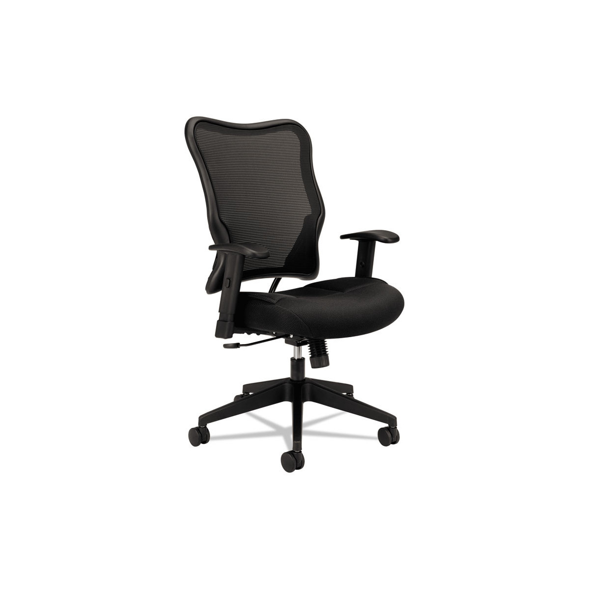 2-to-1 synchro tilt provides a deep, comfortable recline. Highly-styled breathable mesh back. Mesh seat cushion with two layers of padding for increased comfort. Height-adjustable arms accommodate a variety of users. Five-star base with casters for easy mobility.