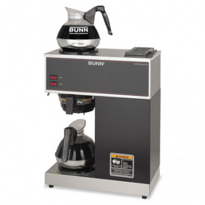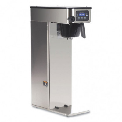 Simple switch-control office brewer that does not require plumbing or special wiring. Just pour cold water in the top and coffee brews immediately. Features two separately controlled warmers. Low profile design fits on most countertops. Stainless steel hood and base with black accents cleans easily with a damp cloth. SplashGard® funnel deflects hot liquids away from hands. Brewing capacity: 3.8 gallons per hour. Server(s) sold separately.