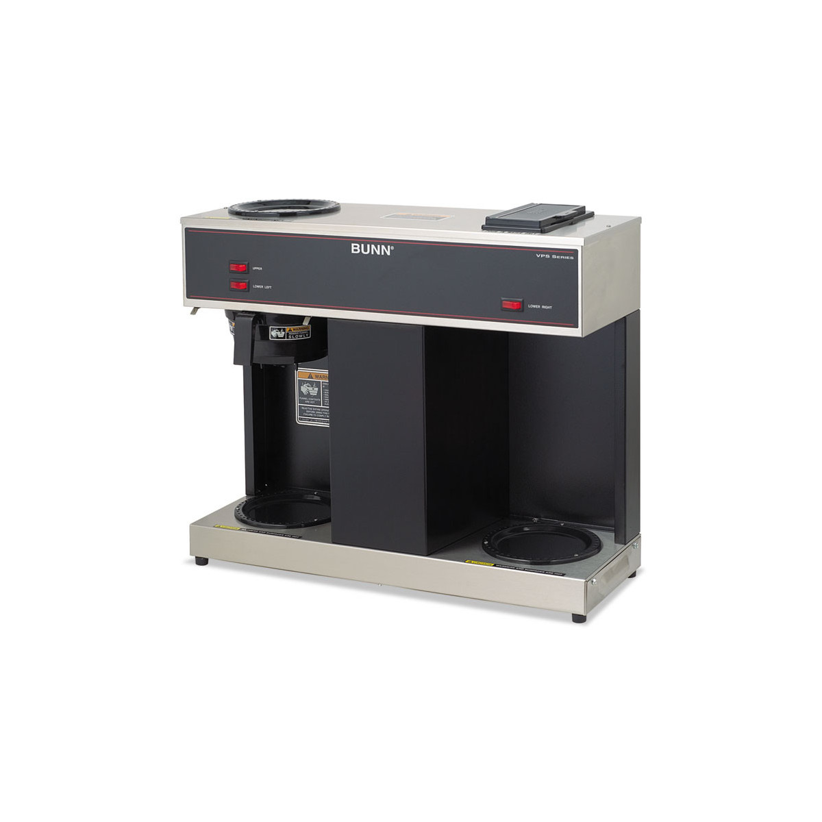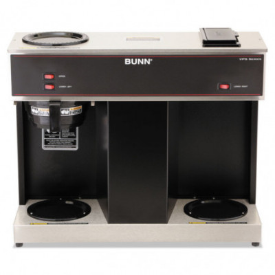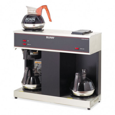Simple switch-control office brewer that does not require plumbing or special wiring. Just pour cold water in the top and coffee brews immediately. Features three separately controlled warmers. Low profile design fits on most countertops. Stainless steel hood and base with black accents cleans easily with a damp cloth. SplashGard® funnel deflects hot liquids away from hands. Brewing capacity: 3.8 gallons per hour. Server(s) sold separately.