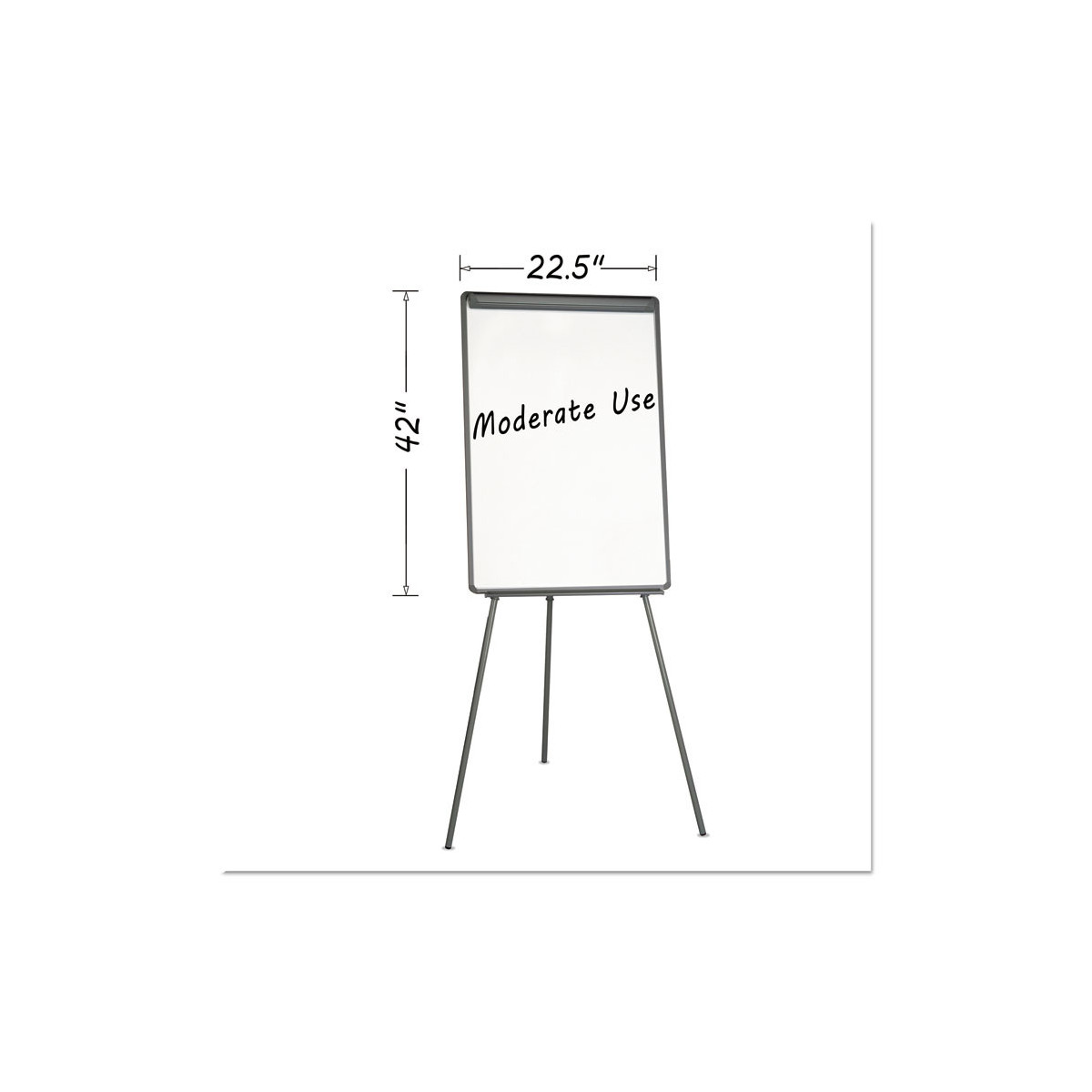 The economic Tri-Pod Presentation Easel matches value with performance and features a traditional three leg design. Height adjustable, to be used on either the floor or a table. The nonmagnetic melamine surface has an aluminum frame and is suitable for moderate use. Equipped with a generous full length marker tray, it holds any size of easel pad with its no pinch pad retainer. It is constructed with a lightweight adjustable tubular frame that folds flat for easy storage.