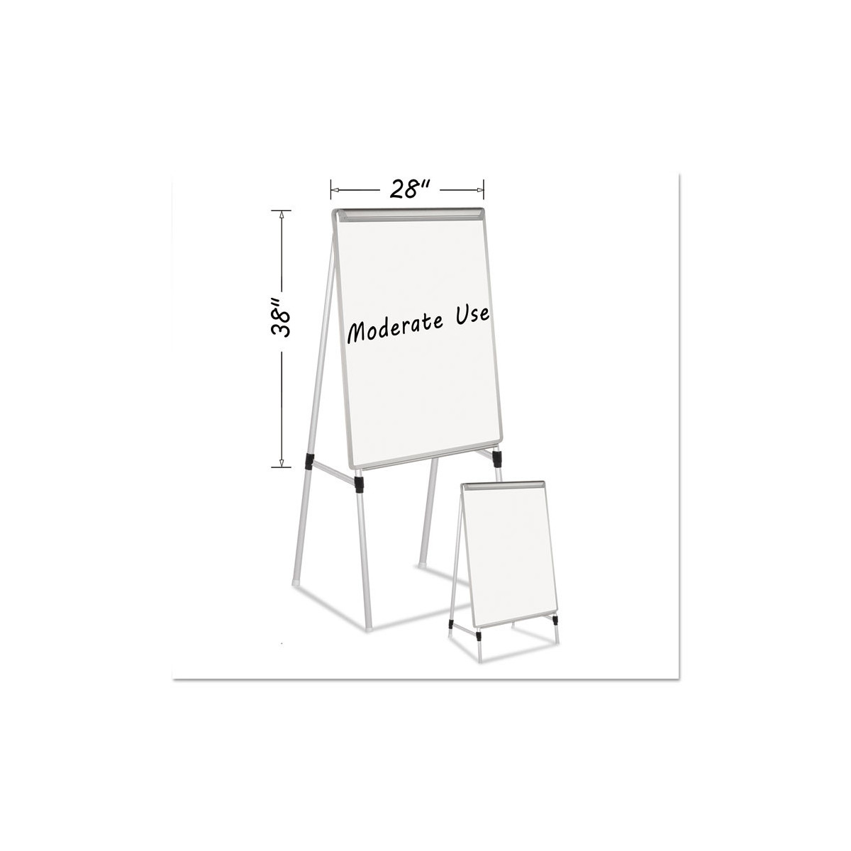 The MasterVision Silver Easy Clean Dry Erase Quad-Pod Presentation Easel is versatile enough to be used on a table or extended for floor use. The nonmagnetic melamine surface is suitable for moderate use. With four legs that have additional bracing, this easel is exceptionally sturdy. It features an easy one-handed, no-pinch, fully adjustable easel pad holder and full length aluminum pen tray. A good value, this easel folds easily for storage or transport.
