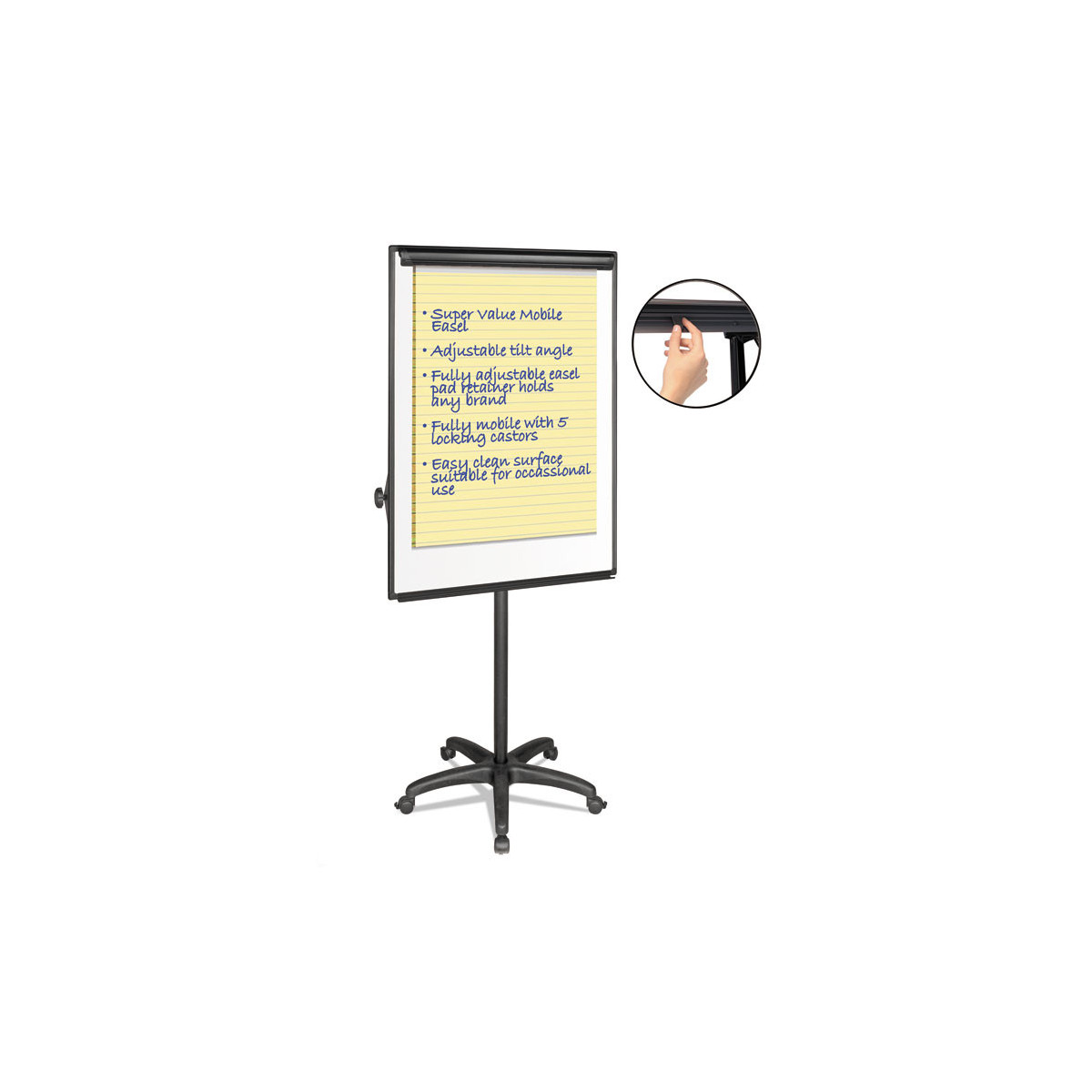 This basic mobile easel allows you the versatility of mobility at a genuine value. The lacquered magnetic steel surface is ideal for frequent use. The board tilts for comfort, and the no-pinch patented pad retainer is fully adjustable and will hold any size or brand pad. This is constructed with an aluminum frame.