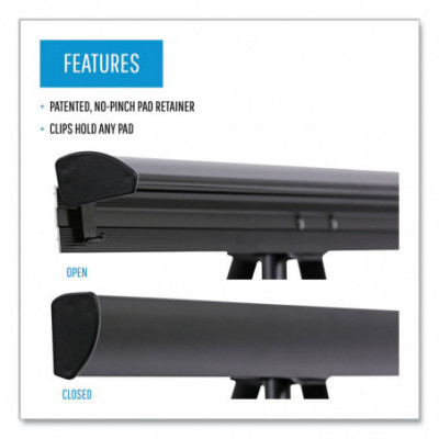 Telescoping metal legs adapt to floor or tabletop use while adjustable support brackets display materials at exactly the height you need. No-pinch pad retainer for fast and easy attachment; hooks slide to fit any type of easel pad.