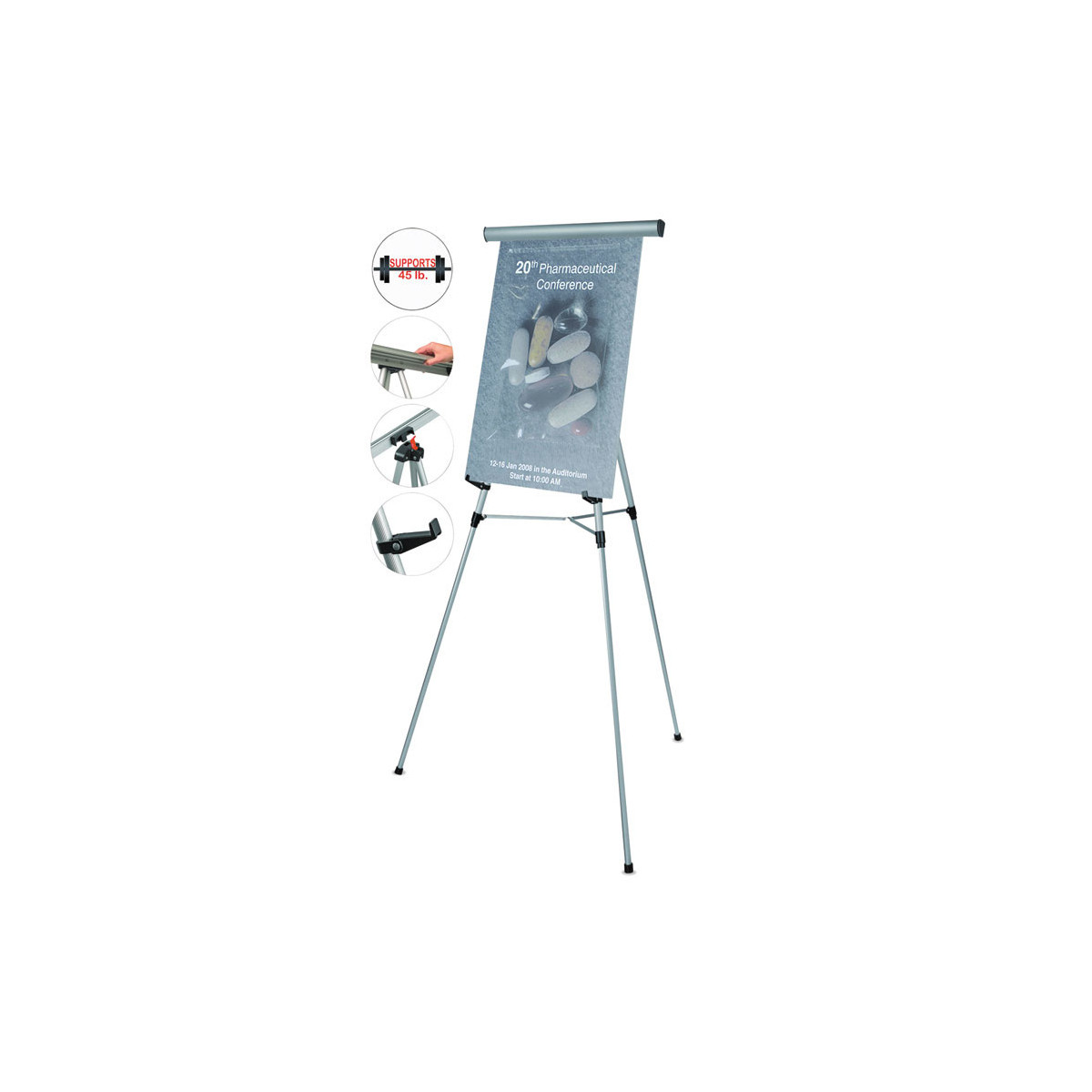 Telescoping metal legs adapt to floor or tabletop use while adjustable support brackets display materials at exactly the height you need. No-pinch pad retainer for fast and easy attachment; hooks slide to fit any type of easel pad.