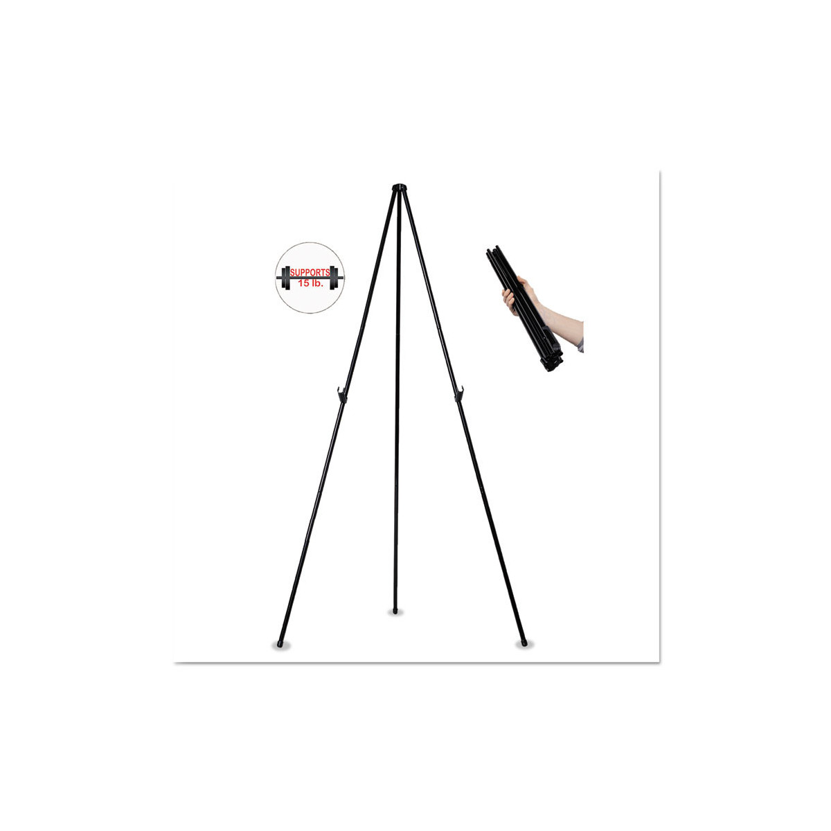 The MasterVision™ Instant Display Easel is ideal for holding signs or boards and has a sturdy display capacity. This portable display solution is perfect for trade shows or sales calls; anywhere transport is necessary. The adjustable support brackets and non-skid feet ensure that your item is always securely posed. The easel easily extends and locks to its full height for quick presentation set-ups; and when not in use, it can quickly collapse down to a compact size that's small enough to fit into most briefcases and bags