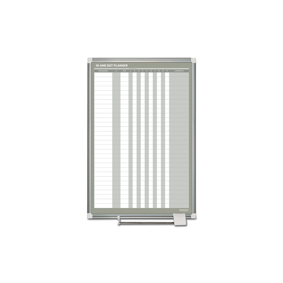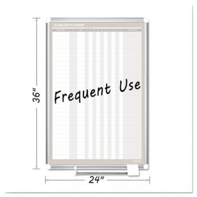 In & Out board features rows for employees or visitors and is perfect for displaying staff schedules. Magnetic Gold Ultra™ lacquered steel dry erase surface is recommended for frequent use. Sliding aluminum pen tray keeps markers and magnetic accessories where you want them. Aluminum frame features the four-corner system for easy mounting.