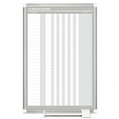 In & Out board features rows for employees or visitors and is perfect for displaying staff schedules. The Magnetic Gold Ultra™ dry erase lacquered steel surface is recommended for frequent use. The Sliding aluminum pen tray keeps pens and magnetic accessories where you want them. Aluminum frame features the four-corner system for easy mounting.