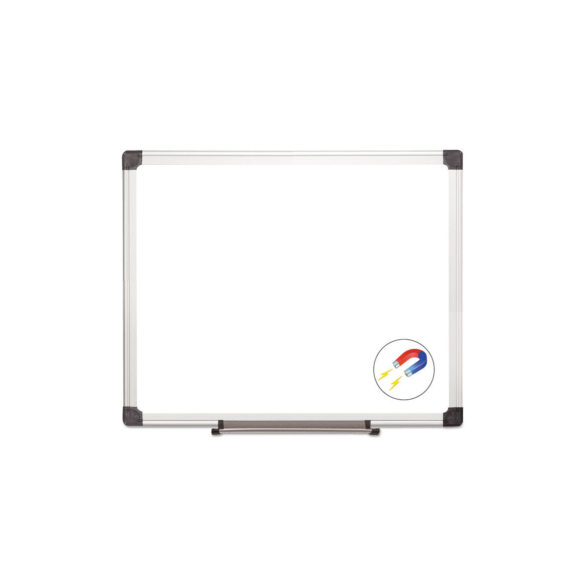 The Maya Magnetic Steel Dry-erase Board features a durable whiteboard surface and high-quality appearance through years of frequent use. Magnetic surface allows you to instantly post messages or attach your magnetic accessories. The professional Maya aluminum frame includes a four-corner mounting system that can be positioned either vertically or horizontally to provide versatility when reconfiguring an office or where wall space is limited. The adjustable pen tray offers a convenient way to keep your writing utensils within quick reach. This dry-erase board is perfect for classrooms, offices, training environments, meeting rooms and more.
