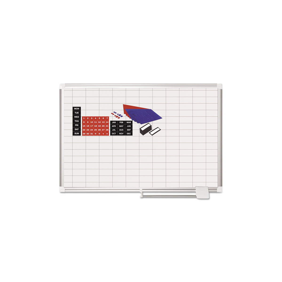 Gridded Magnetic Steel Dry Erase Project Planning Board, 1" x 2" Cells, 36" x 24", White Surface, Satin Aluminum Frame