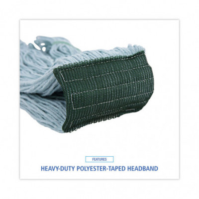 Boardwalk® EcoMop is a quality mop head with looped-end construction. Built with a thick and durable tailband that provides longevity and excellent laundering performance. Constructed from high-quality synthetic content that is designed to increase abrasion resistance. A single mop head absorbs more than four times its weight in water. The 4-ply synthetic and cotton fibers shed less lint. No post-recycling dyes.