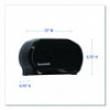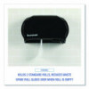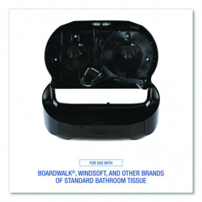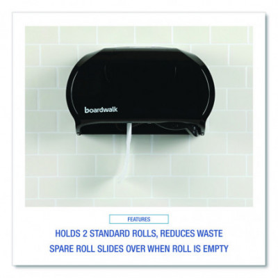 Twin tissue dispenser works to reduce run-outs and prevent waste. Compact double roll standard tissue dispenser takes up a minimum of space; perfect for small restrooms. Two-roll capacity with auto-transfer prevents paper run-outs, with second roll automatically sliding into place after initial roll is depleted. 1.5" mandrel. Tough, easy to clean industrial plastic.