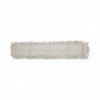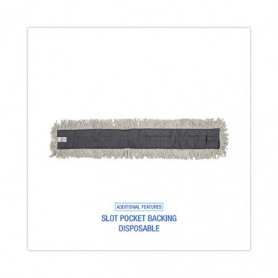 Four-ply, pretreated yarn, dust mop head. Equipped with a slot pocket backing which allows a metal dust mop frame to slide into its place quickly and easily. Sewn center fringe for added coverage and durability. The disposable head can be discarded when dirty. Ideal for use on floors that require dusting, with or without cleaning spray. Handle and frame are sold separately.