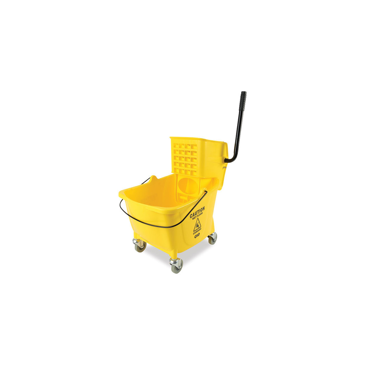 Boardwalk® Pro-Pac™ Side-Squeeze Wringer/Bucket Combo is an ultra-durable combo bucket that features a reliable, professional-grade, leak resistant design. Foam-grip handle increases wringer-use comfort and stability. Equipped with four, durable, 3" swivel casters that enable easy maneuverability. Bright yellow color stands out when in high-traffic areas. Great for cleaning industrial restrooms, hallways, dining rooms, kitchens, lobby areas, and communal spaces. Compatible with most cotton and synthetic mops.