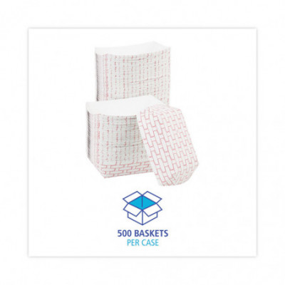 Boardwalk® paper food baskets are an excellent alternative to disposable dinnerware. These baskets are composed of moisture-resistant clay-coated, sturdy paper. The flexible design with high walls to prevent spills is ideal for serving meals to-go at restaurants, cafeterias, food trucks, catering, and special events. Available in a classic, attractive, red and white design to suit all of your disposable dining needs.