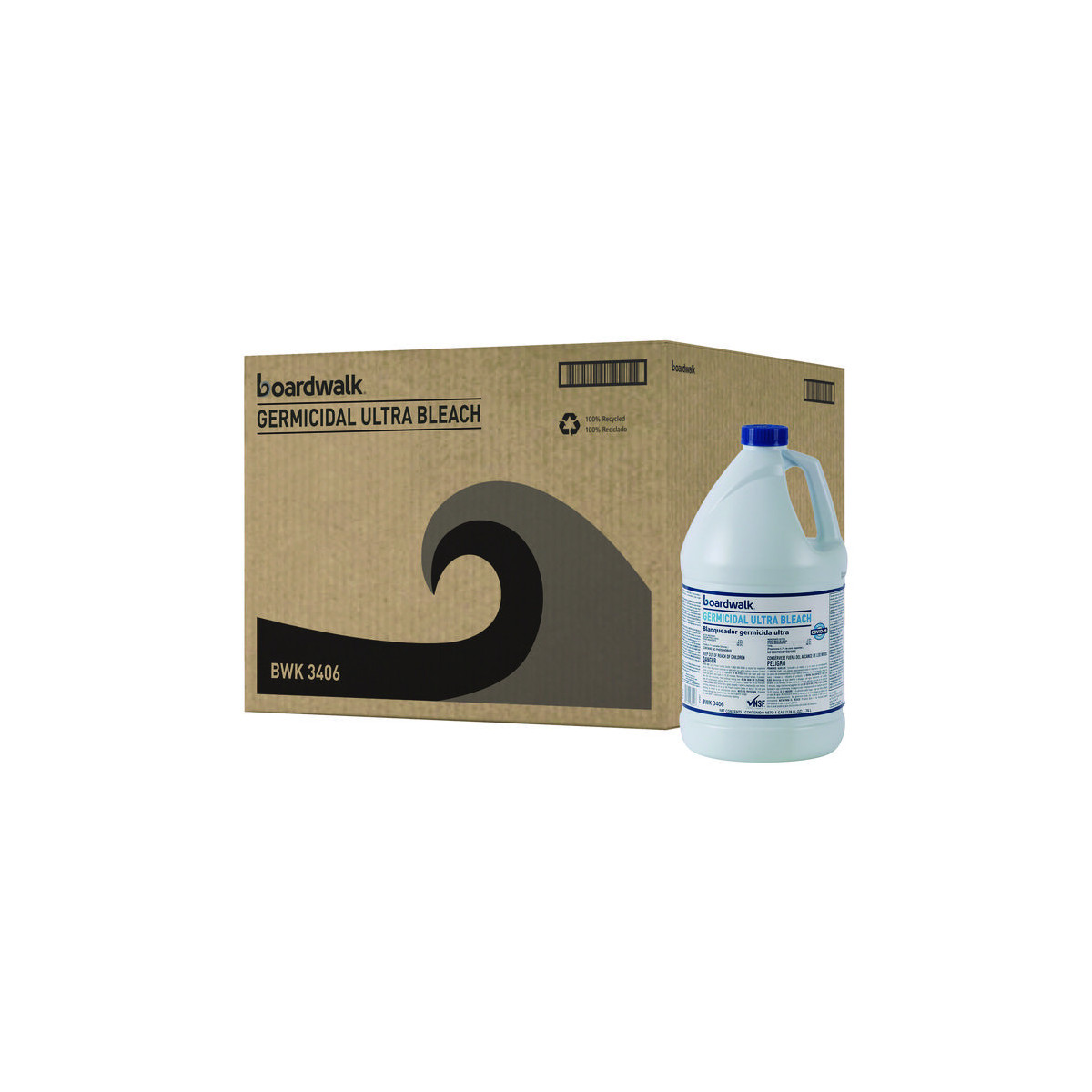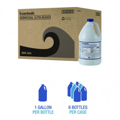 Boardwalk® Germicidal Ultra Bleach cleans, deodorizes, and disinfects with ease. The multi-use liquid can be used to remove tough stains, bacteria, organic matter, stains and whiten clothes. Also works as a hospital-grade disinfectant to kill a broad spectrum of microorganisms, including staph and strep bacteria, MRSA, and E. coli. Twist cap bottle with liquid bleach is a versatile and economical cleaning tool.