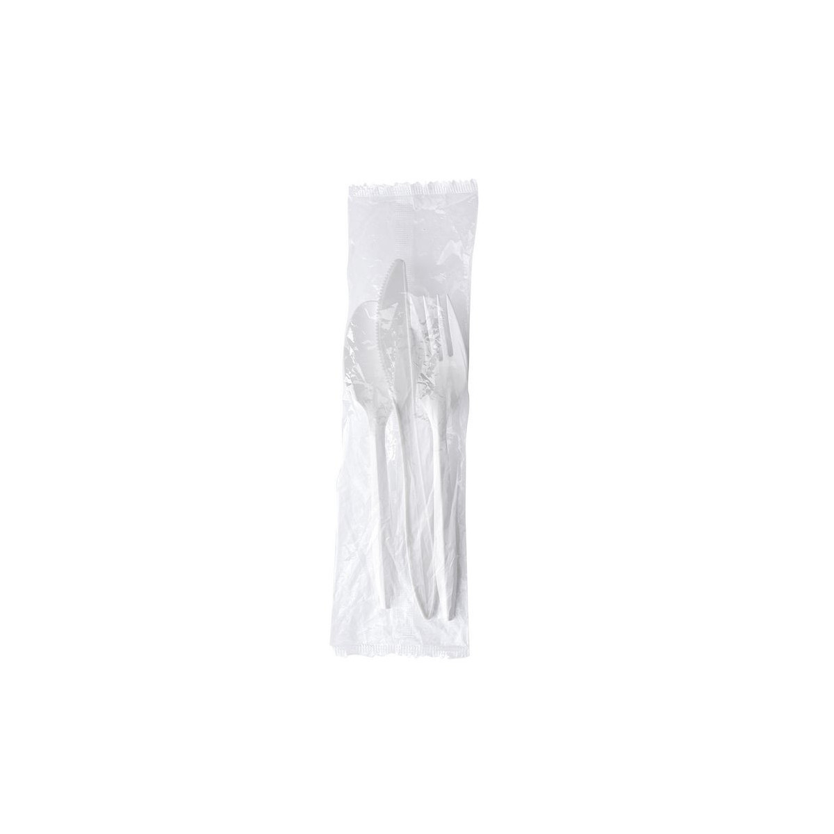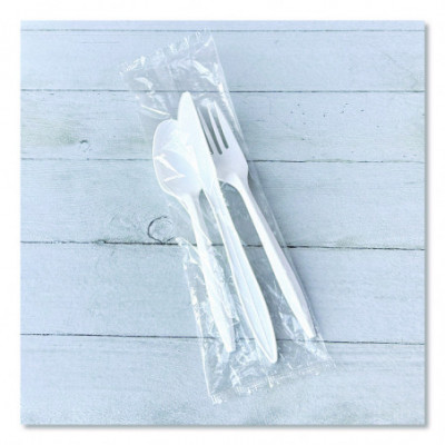 Serve virtually any meal with this cutlery kit. Each pre-packaged, cutlery wrapped kit contains a medium weight plastic fork, spoon, and knife. The convenient kits make set-up for an event or packing a to-go meal quick and easy. Individually packaged for convenience and to ensure utensils remain sanitary, even after handling. Perfect for outdoor gatherings, large parties, and take-out meals.