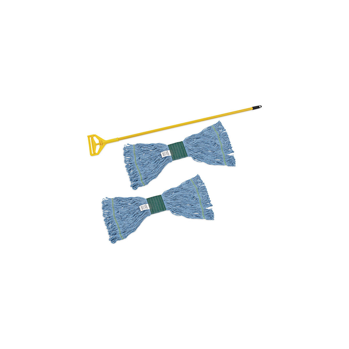 Boardwalk® Looped End Mop Kit includes everything you need to get started mopping, a strong, quick change handle and two quality, looped-end, blended fiber mop heads. The absorbent, medium, blue mop heads are machine washable for long-term usage. Great, all-purpose yarn is suitable for any cleaning job on a variety of indoor floor surfaces. The durable, 60", yellow handle is made from a combination of strong metal and polypropylene, with a plastic, quick change head that makes cleaning easy.
