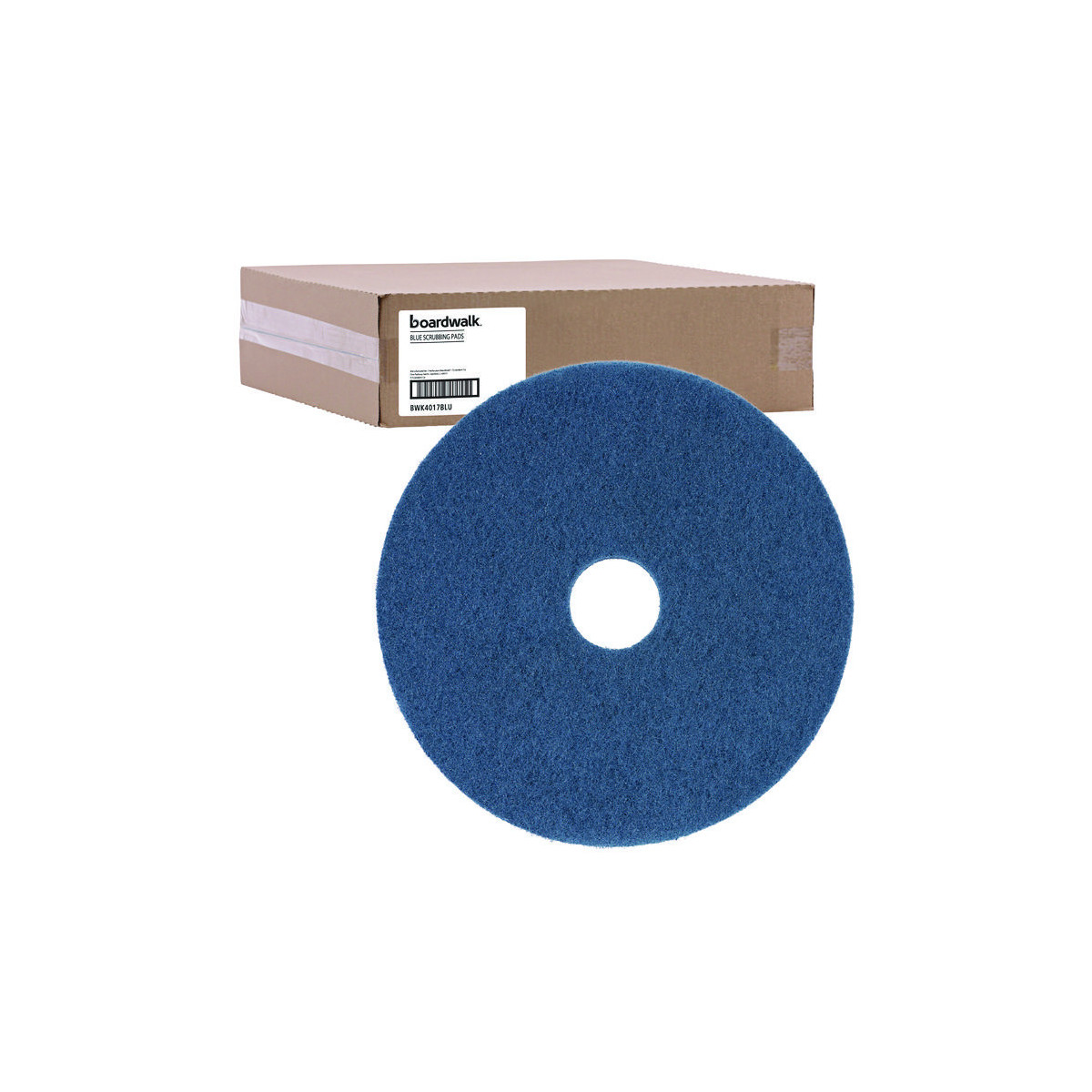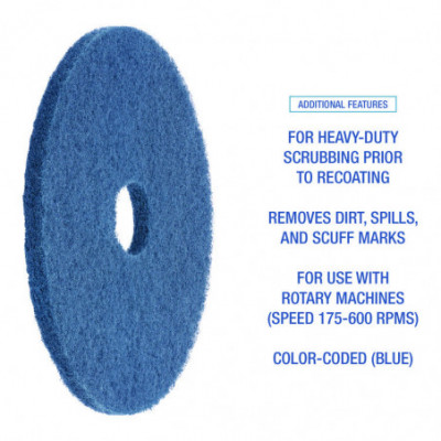 Heavy-duty scrubbing pad attaches to a rotary machine to remove dirt, spills, and scuffs. Easily scrub floors by mounting the pad onto the machine and let the powerful scrubbing pad go to work, removing heavy traffic and build-up with ease. The surface is cleaned, removed of debris, and ready for recoating if needed. For use with Rotary Machine Speed of 175 to 600 RPM. Color-coded for easy job identification.