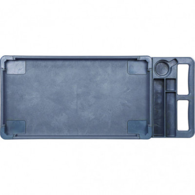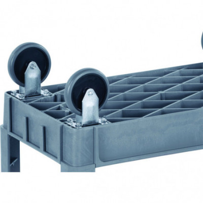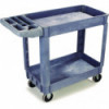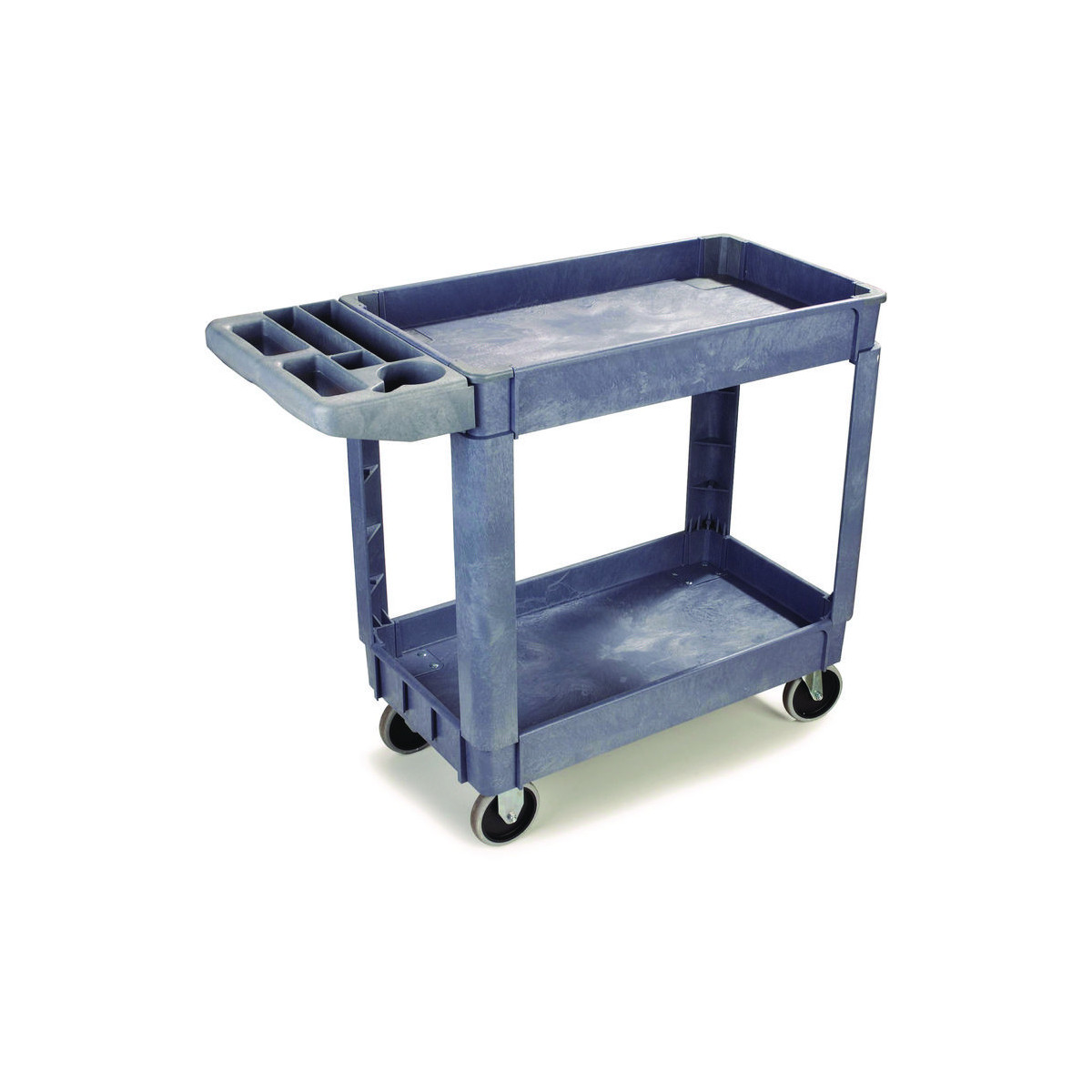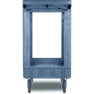 Durable resin construction, gray, two-shelf utility cart with casters. Molded-in plastic handle allows for easy steering on the go. The handle and raised top rim are great for hanging cleaning products and supplies to tackle cleaning jobs from one room to the next. Round and rectangular top compartments keep small items like cords and tools organized. Convenient swivel casters allow multi-directional travel around tight corners. Two fixed shelves provide sturdy storage for all your janitorial supplies.