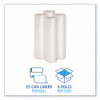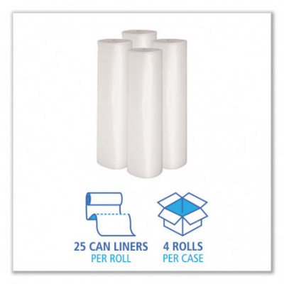 Can liner with equivalent strength of 2 mil liner. Perforated roll for easy dispensing. Coreless rolls save space and material.