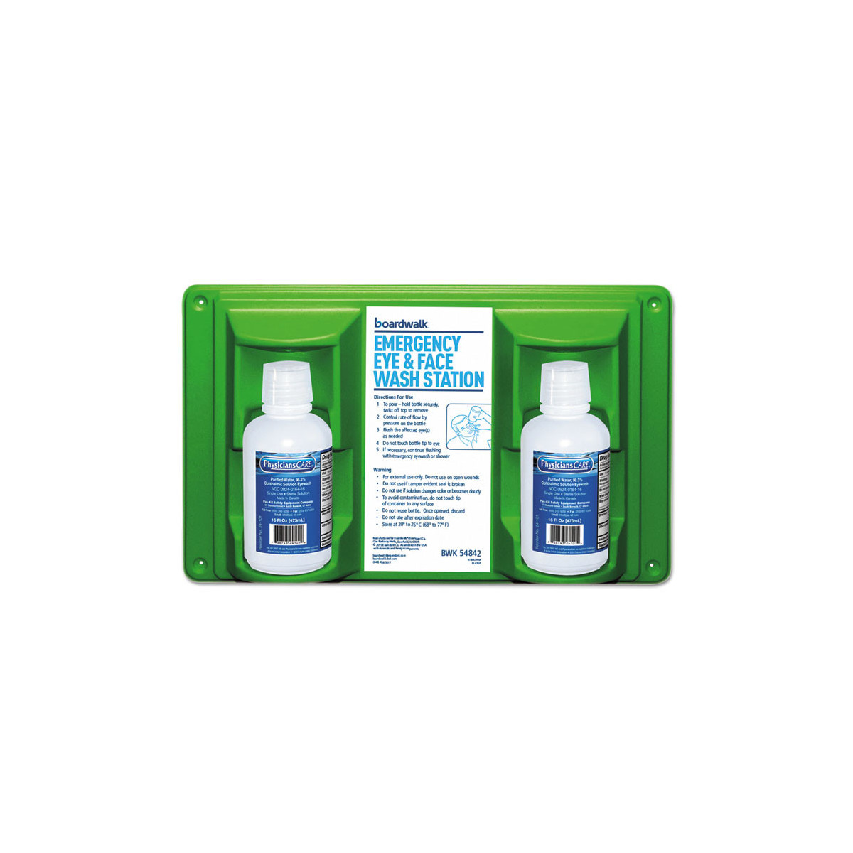 This emergency eyewash station conveniently includes twin bottles of eye wash as well as wall mounting hardware. Provides easy access to solution in emergency situations. A reliable choice for flushing or irrigating the eyes. Includes eye cup for easily focusing the fluid stream into affected eye. Provides immediate emergency eye flushing when a larger eyewash station is not close by.
