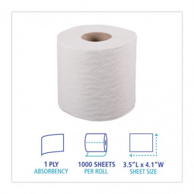Boardwalk® One-Ply Toilet Tissue is soft and absorbent, embossed white paper bathroom tissue. Made with facial quality softness for a quality bathroom experience. One-ply with embossing for added absorbency. Ideal for high-traffic restrooms in for offices, schools, restaurants, healthcare, industrial, and retail settings. Dispensers sold separately. Safe for sewer and septic systems.